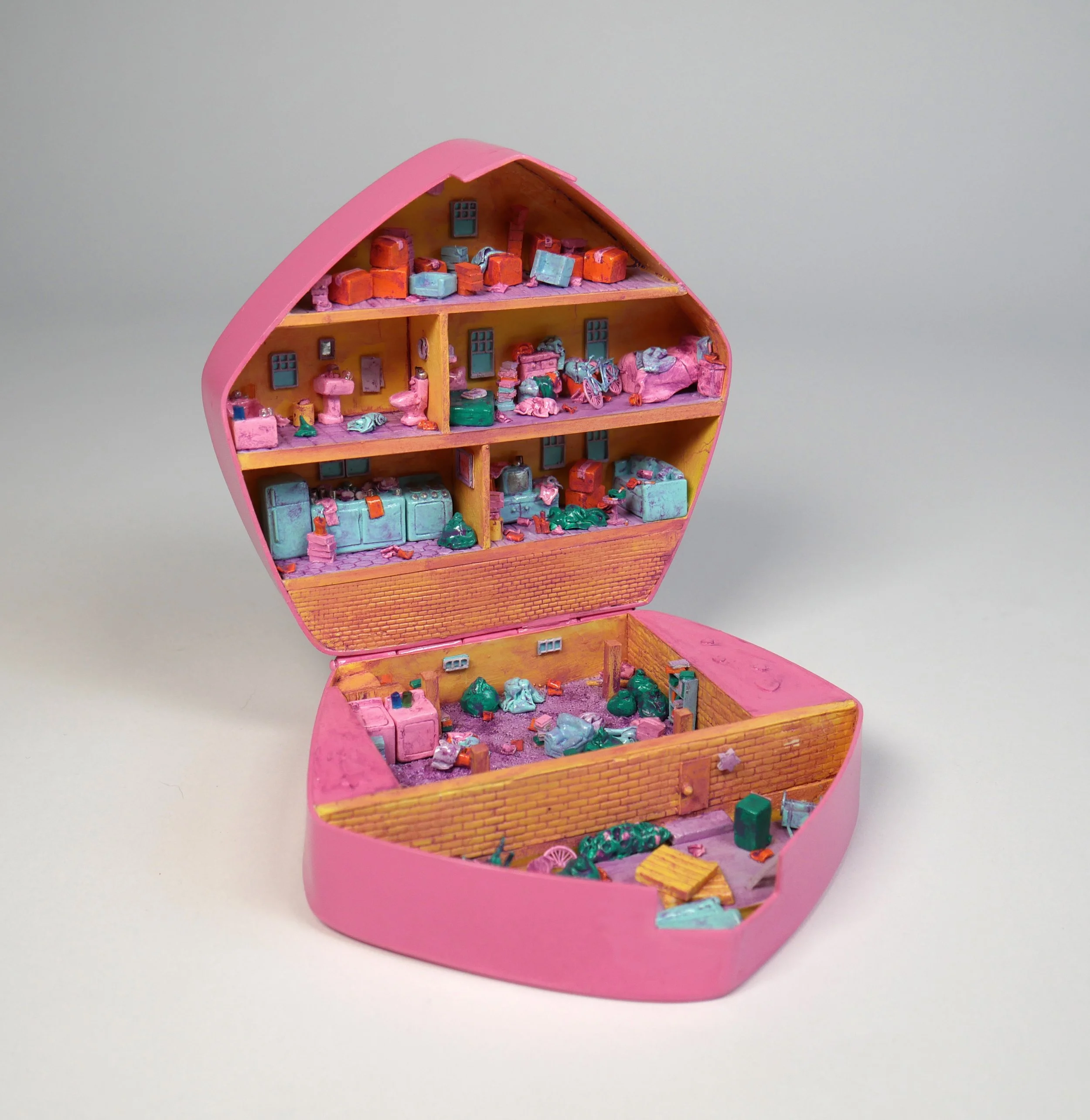 Rather than aiming for exact replicas, my sculptures are three-dimensional collages of various concepts that reflect the challenges of living with mental illness. The overwhelming accumulation of possessions depicted in my work represents the unsafe living conditions and impaired daily functioning often experienced by individuals with compulsive hoarding disorder. Beyond physical clutter, I examine the emotional impact of hoarding, exploring how objects can hold memories, provide comfort, and shape our identities. Through thing theory, a subset of critical theory that explores human-object interactions, I contemplate how objects influence our behaviors and relationships.
